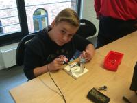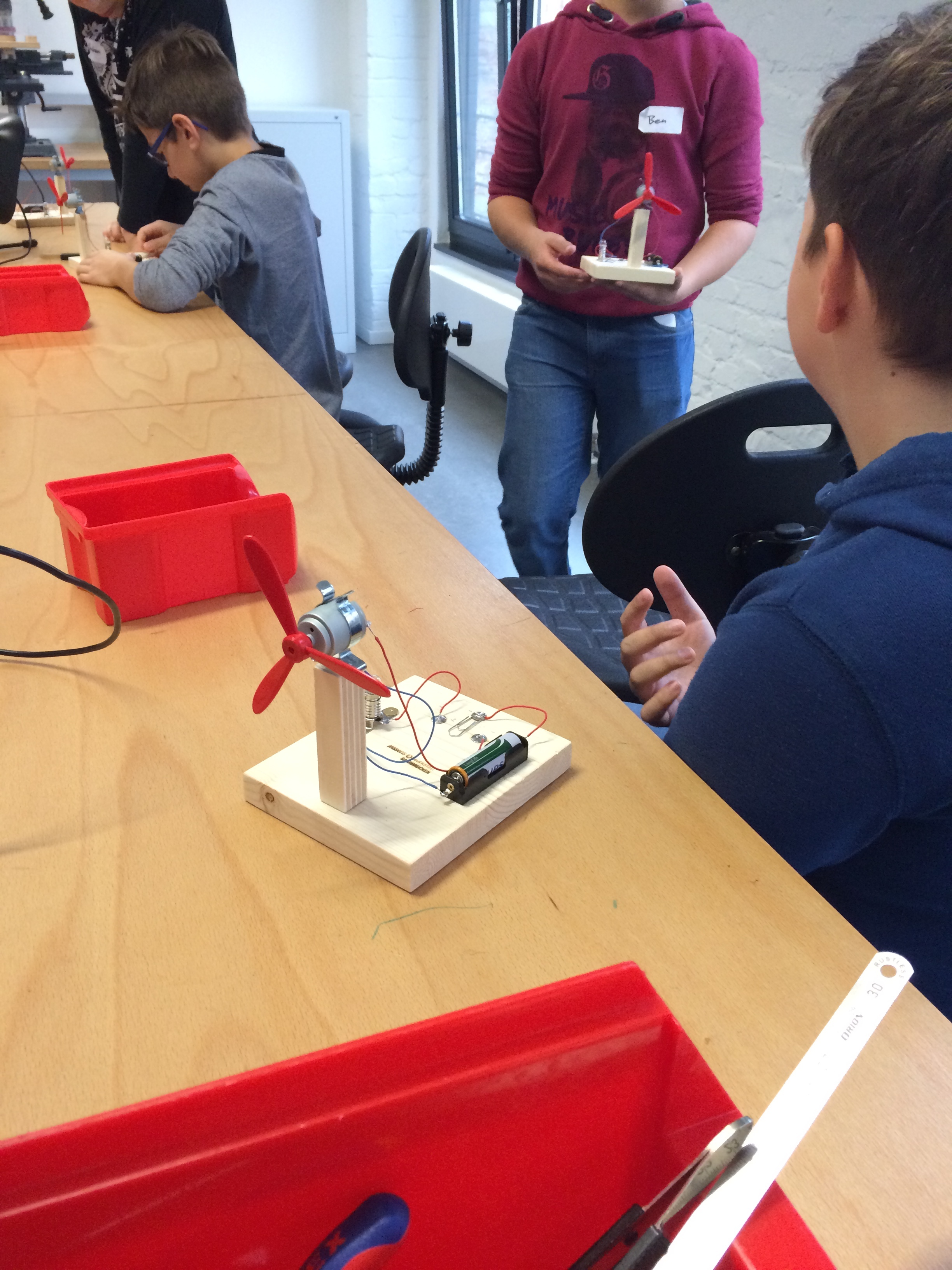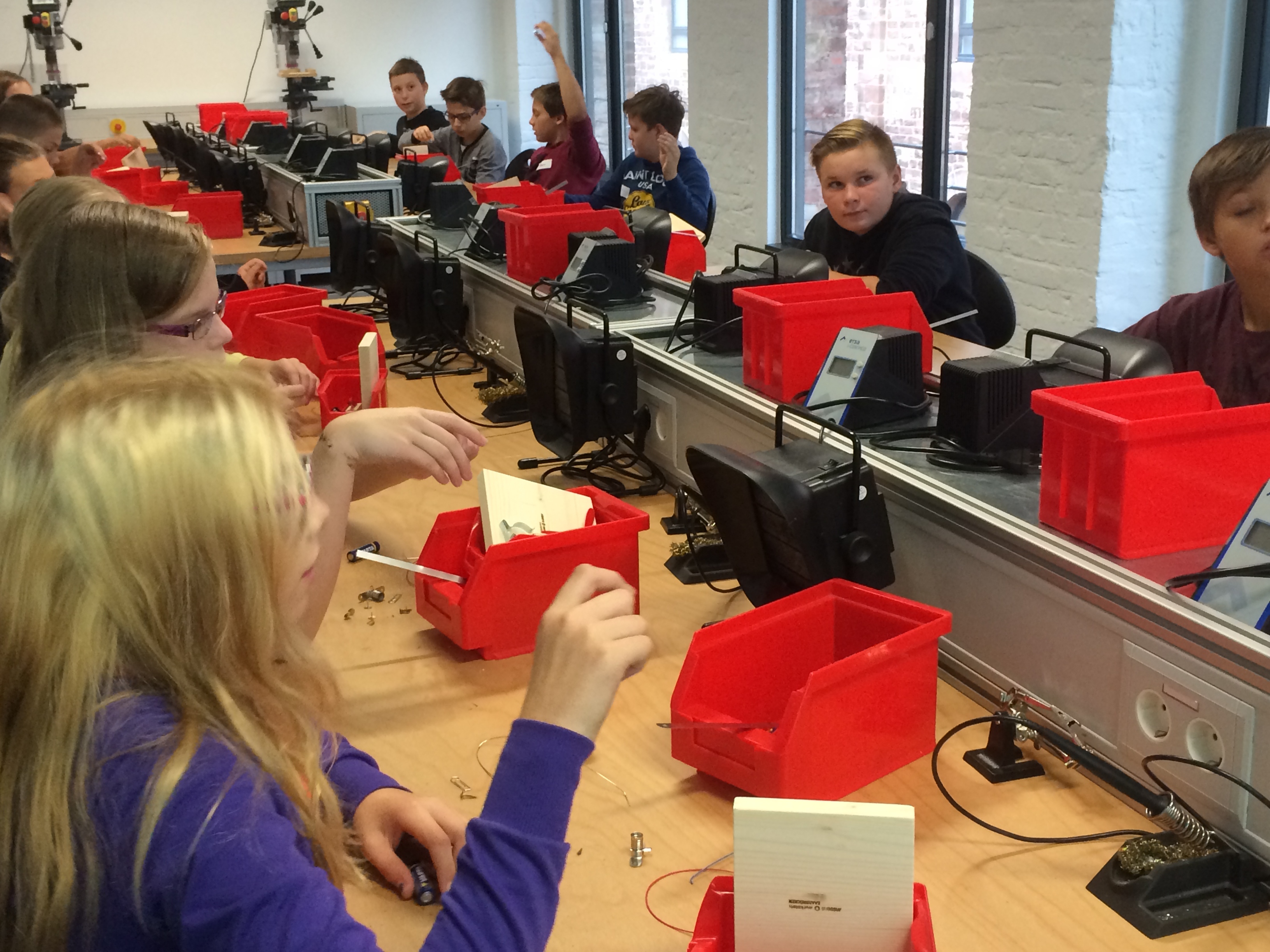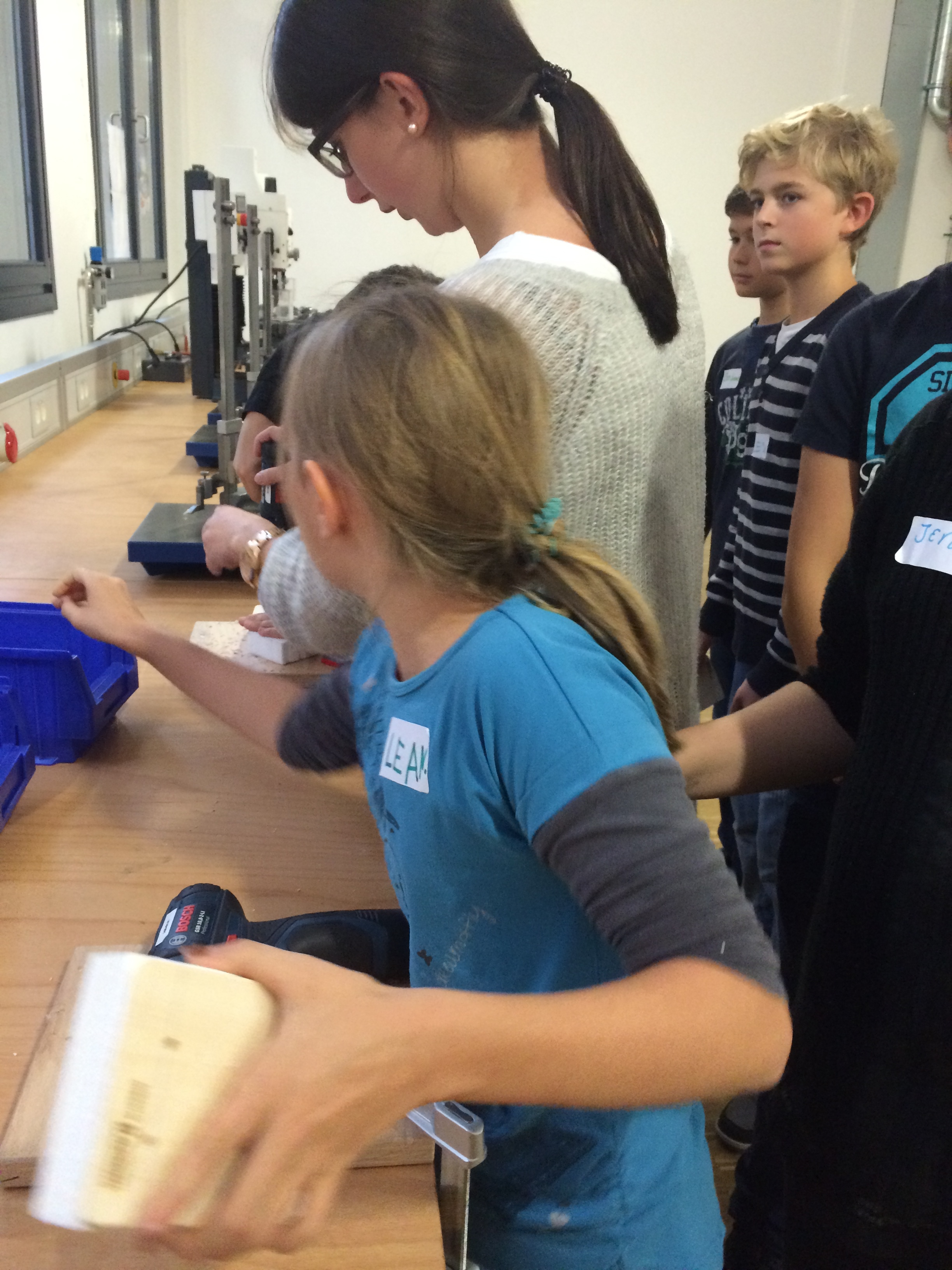 43 Schülerinnen und Schüler besuchten am Mittwoch (16.09.15) zusammen mit ihren Klassenlehrerinnen die Wissenswerkstatt in Saarbrücken. Hierbei handelt es sich um einen außerschulischen Lernort, der die Schüler an technische Berufe heranführen soll. In drei Gruppen wurden die Neugierigen in den Werkstatträumen herumgeführt, betreut und angeleitet. Jeder konnte nach drei Stunden ein selbst hergestelltes Werkstück mit nach Hause nehmen. Die erste Gruppe fertigte in der unteren Werkstatt des alten Bahnhofgebäudes einen Kerzendampfer, der allein durch die Wärme eines Teelichtes angetrieben wird. Im oberen Stockwerk baute die zweite Gruppe einen einfachen Stromkreis, der einen kleinen Ventilator und eine Glühbirne antreibt. In der dritten Werkstatt wurde mit Zahlen jongliert. Jeder Schüler hatte als Ergebnis eine selbstgebaute „Rechenmaschine“ im Gepäck. Mit freudiger Erwartung, die selbstgebauten Werkstücke Freunden und Eltern zu zeigen und auszuprobieren, machten sich alle auf den Heimweg.