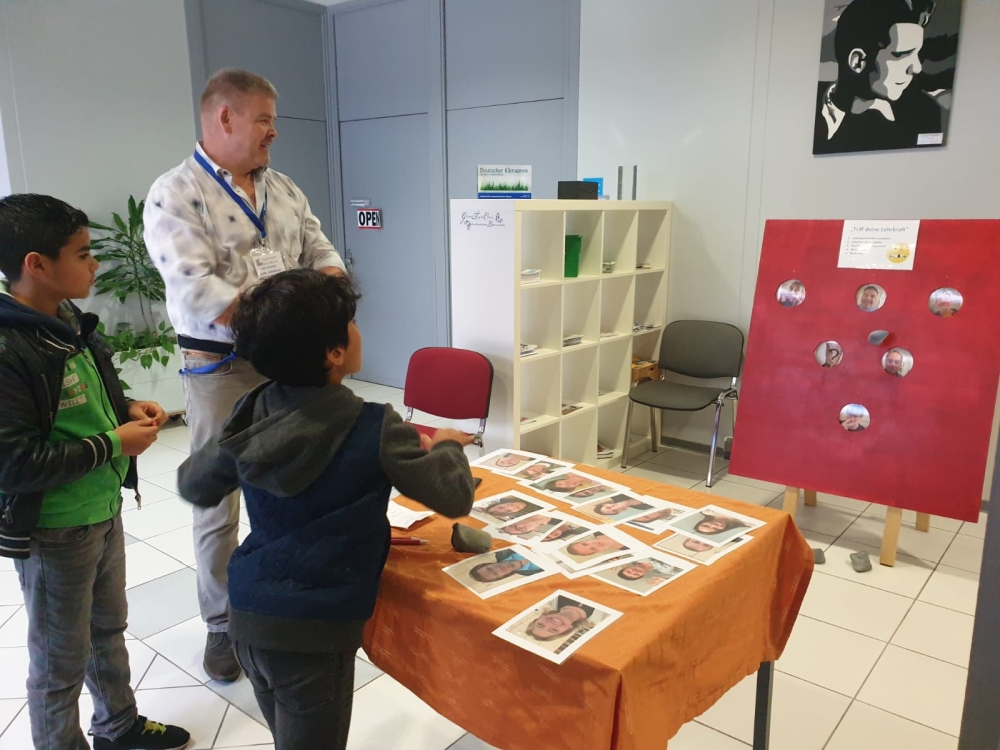 Frau Behet konnte Herrn Port vom Blieskasteler Schutzengelverein einen Scheck über 3456,50€ überreichen. Diesen Betrag hatte die Schulgemeinschaft beim Schutzengellauf im Mai 2019 erlaufen. Danke an alle Sponsoren für die schöne Summe, damit hat die GSS bei den bisherigen neun Schutzengelläufen mehr als 50000€ erlaufen. In diesem Kontext stellten einige Schüler der Ethikgruppen das Projekt Demokratie, Toleranz und Nachhaltigkeit vor, das unter der Leitung von Herrn Peters in den nächsten Monaten an der Schule durchgeführt wird. Darüber wird noch zu berichten sein. Im Rahmen einer Siegerehrung überreichte Herr Weyrauch die Ehrenurkunden vom Sportfest. Aber wer war der neue Mitschüler oder die neue Lehrkraft, die am Eingang winkend unsere Gäste begrüßte?